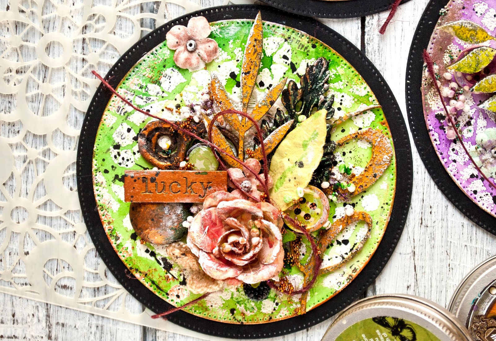 I used Old Walls Texture Paste and Aged Brass Wax by Finnabair on my chipboards.