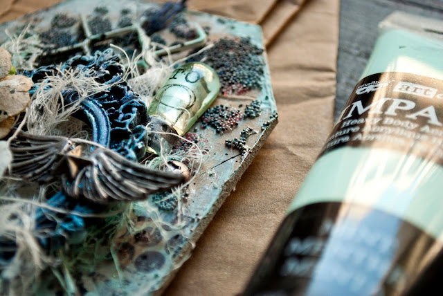 with Impasto paint in Mint color and some stamps. Different embellishments like